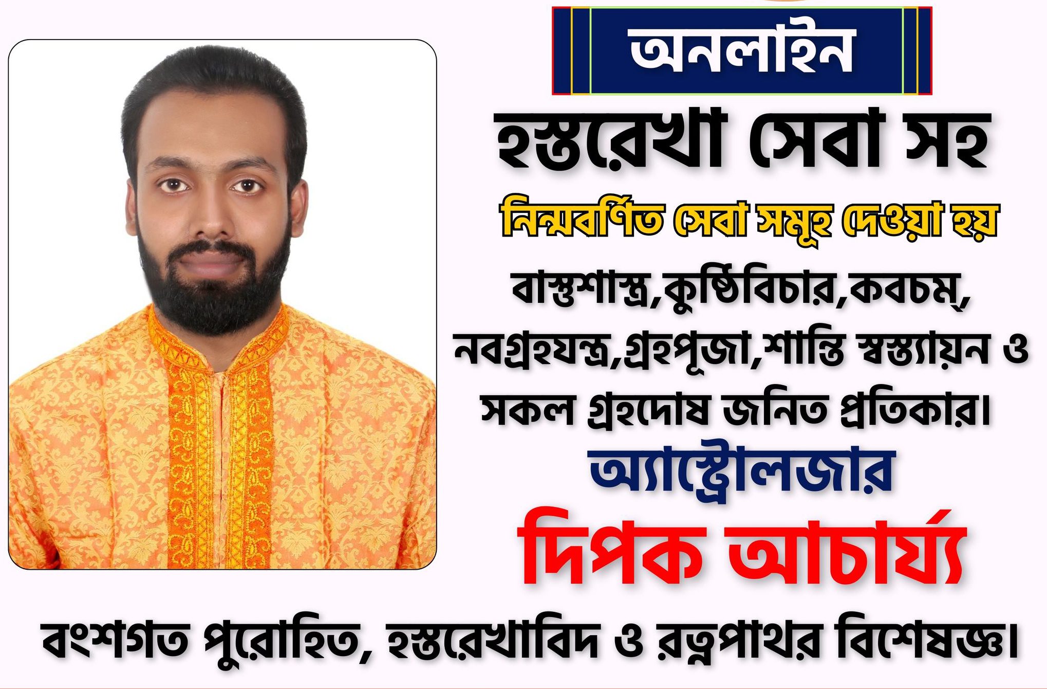 ৮০% ডিসকাউন্টে নামমাত্র মূল্যে স্বনামধন্য জ্যোতিষ দীপক কুমার আচার্য্য আপনার হস্তরেখা বা হাত দেখে আপনার ভাগ্য বলে দিতে পারবেন। এর পাশাপাশি আপনার জন্য কোন প্রতিকার বা ব্যবস্থা গ্রহণ করলে এ সমস্যা কাটিয়ে আপনি আপনার ভালো সময়ে ফেরত যেতে পারবেন তা নির্ধারণ করে দিতে পারবেন।